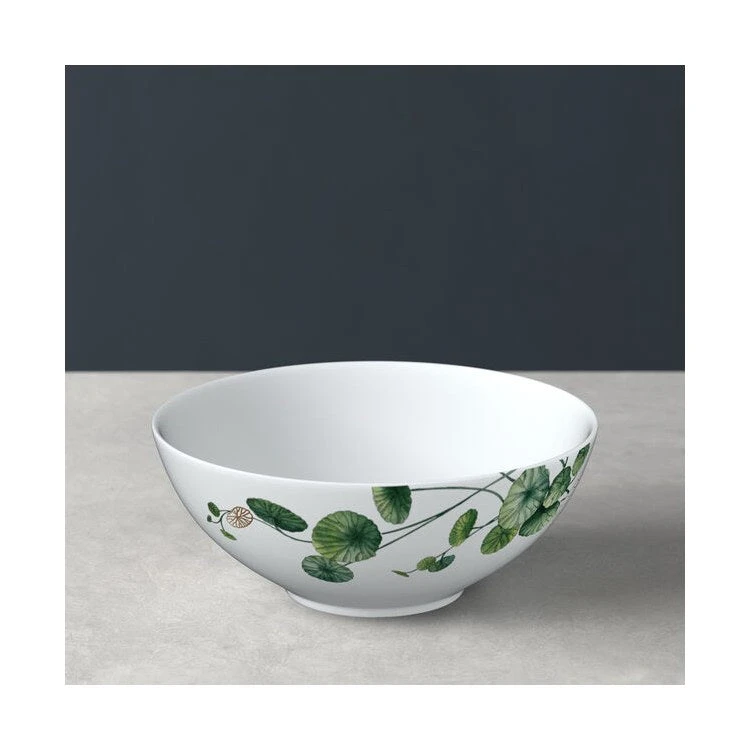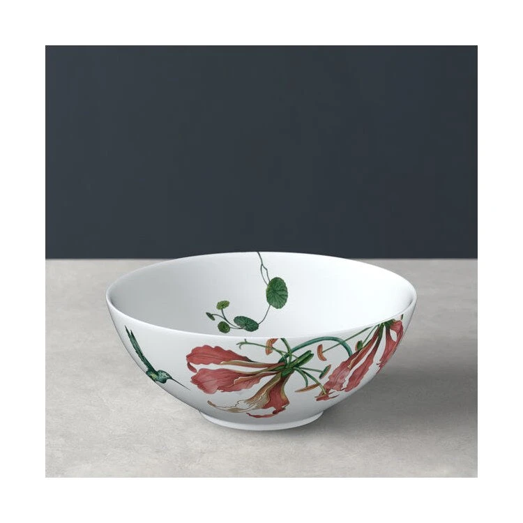 Avarua transforms the dining table into an imaginative paradise where flora and fauna can unfold their beauty. The collection features intricate flowers, leaves and birds. Premium Bone Porcelain has been designed with elegant red flowers of the Gloriosa superba, mangroves and strelitzia leaves in various greens surrounded by color-coordinated hummingbirds. 22K gold detailing accents the collection and provides a three dimensional effect. Dishwasher safe.
