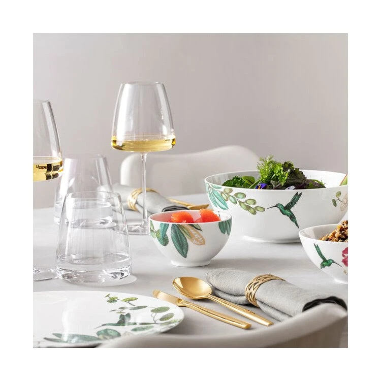 Avarua transforms the dining table into an imaginative paradise where flora and fauna can unfold their beauty. The collection features intricate flowers, leaves and birds. Premium Bone Porcelain has been designed with elegant red flowers of the Gloriosa superba, mangroves and strelitzia leaves in various greens surrounded by color-coordinated hummingbirds. 22K gold detailing accents the collection and provides a three dimensional effect. Dishwasher safe.