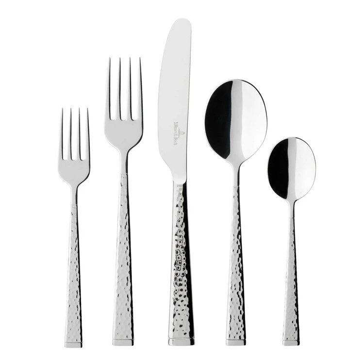 Offering a unique blend of a gleaming finish and a textured surface, the Blacksmith flatware collection brings handsome casual appeal to everyday dining. The handles have a hammered effect that is striking in traditional and contemporary settings alike. This collection is constructed from 18/10 stainless steel and is microwave and dishwasher safe. This 60-piece flatware set consists of twelve dinner spoons, twelve dinner forks, twelve dinner knives, twelve dessert forks, and twelve teaspoons.