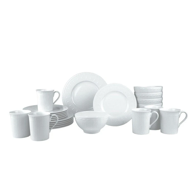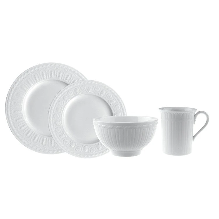 Cellini boasts delicate relief detailing on soft, white shapes, celebrating Renaissance architecture. The collection brings classic elegance to your table with its traditional gracefulness. The Cellini 24-piece dinnerware set consists of six dinner plates, six salad plates. six rice bowls, and six mugs.