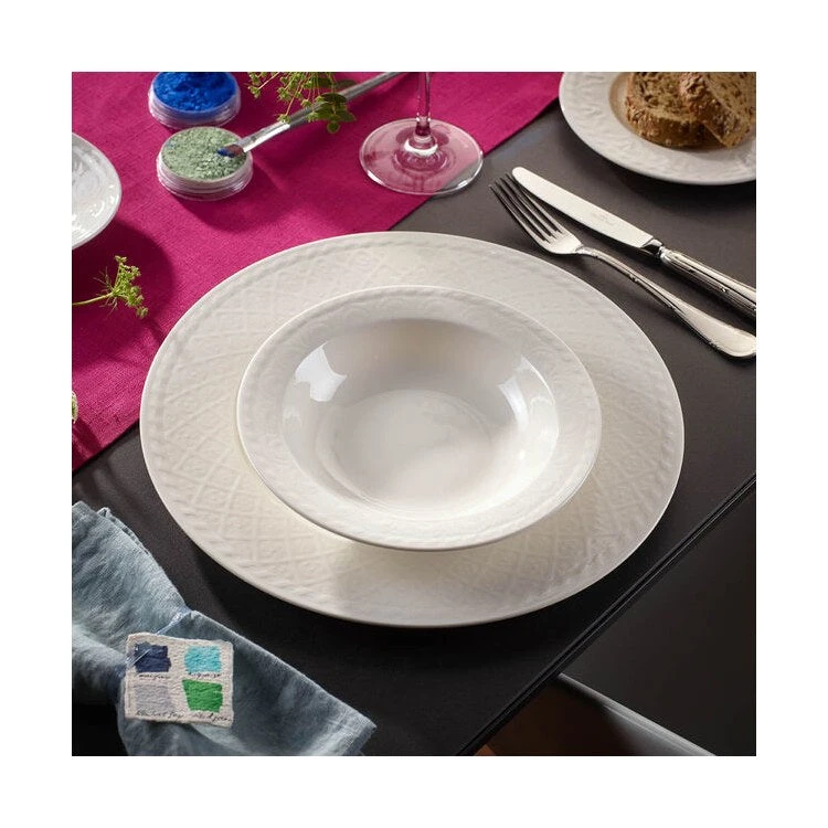 Cellini is a Villeroy & Boch modern classic: understated elegance with a clean form and design for casual dining or gourmet entertaining. Inspired by the detailed work of Italian Renaissance artist Benvenuto Cellini, this collection is sophistication made simple. The twelve piece set includes 4 each: dinner plate, salad plate and soup/pasta plate. Earn yourself a little more leisure time with dishwasher safe durability and microwave safe convenience. High-quality German-made porcelain provides upscale appeal and lasting durability. Villeroy & Boch has been a premium manufacturer of fine porcelain, glassware, flatware, and more since 1748; This is proudly manufactured in Villeroy & Boch’s German factory.
