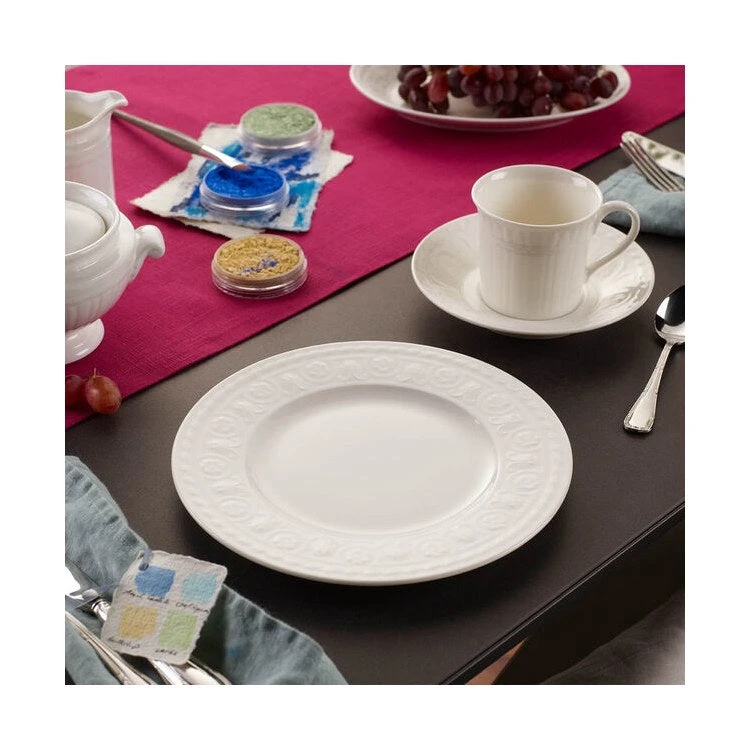 Cellini is a Villeroy & Boch modern classic: understated elegance with a clean form and design for casual dining or gourmet entertaining. Inspired by the detailed work of Italian Renaissance artist Benvenuto Cellini, this collection is sophistication made simple. The twelve piece set includes 4 each: dinner plate, salad plate and soup/pasta plate. Earn yourself a little more leisure time with dishwasher safe durability and microwave safe convenience. High-quality German-made porcelain provides upscale appeal and lasting durability. Villeroy & Boch has been a premium manufacturer of fine porcelain, glassware, flatware, and more since 1748; This is proudly manufactured in Villeroy & Boch’s German factory.