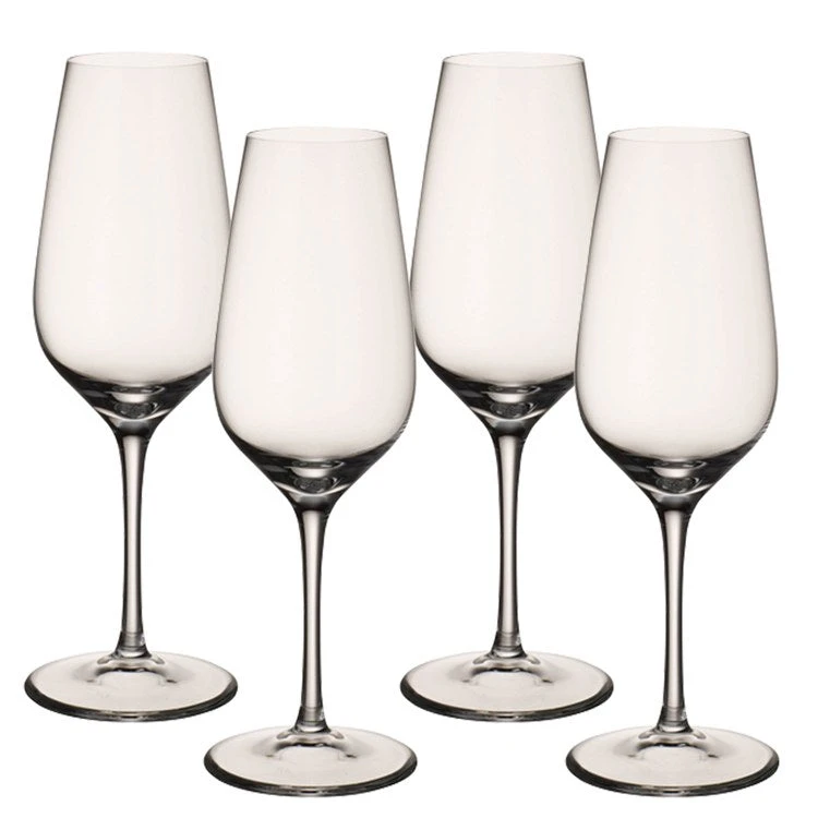 The glasses, goblets, and jugs from Entree have a simple and harmonious shape. Thanks to their classic design, they are perfect for any occasion, ranging from a fresh drink at lunchtime to a cognac after dinner. The collection is especially interesting for novices. Pour champagne in style with Entree. Discover the elegant crystal glass edition. These champagne flutes are ideal for sparkling wines. Set of four.