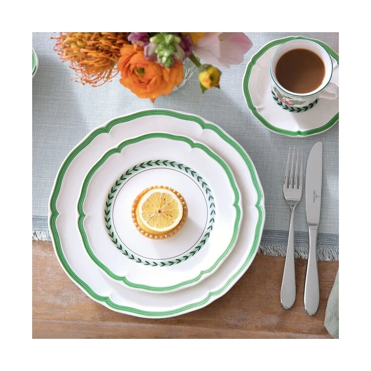Originally designed in 1997, the French Garden collection brings a country cottage charm into your home. The simple, yet sophisticated, Green Line works well alone as well as in combination with the existing French Garden patterns. The Green Line features the well-known scalloped edges and raised curves from the original collection. Premium porcelain is durable, dishwasher and microwave safe. Villeroy & Boch has been creating beautiful tableware since 1748. This product is proudly made in Germany.
