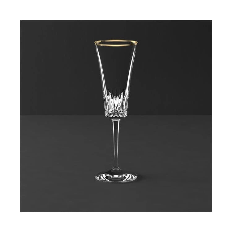 Villeroy & Boch’s Grand Royal glassware collection includes a striking selection of wine glasses, champagne flutes and cocktail glasses that are finely crafted of lead=free, cut crystal glass. Trimmed in precious gold, this luxuriously carved glassware adds glamour to any tabletop it adorns. Lead Free. Dishwasher safe.
