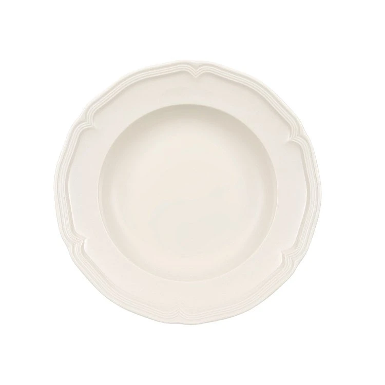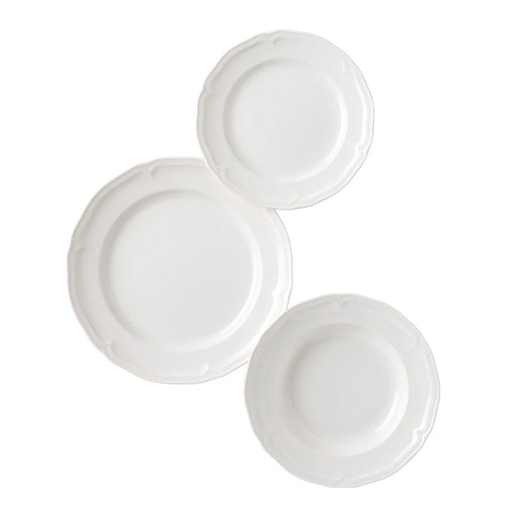 The Manoir collection, made from high-quality premium porcelain, combines naturalness with elegance. Intricate reliefs and decorative rims accentuate the elegant character of the decor. The set consists of six dinner plates, six salad plates, and six soup bowls.