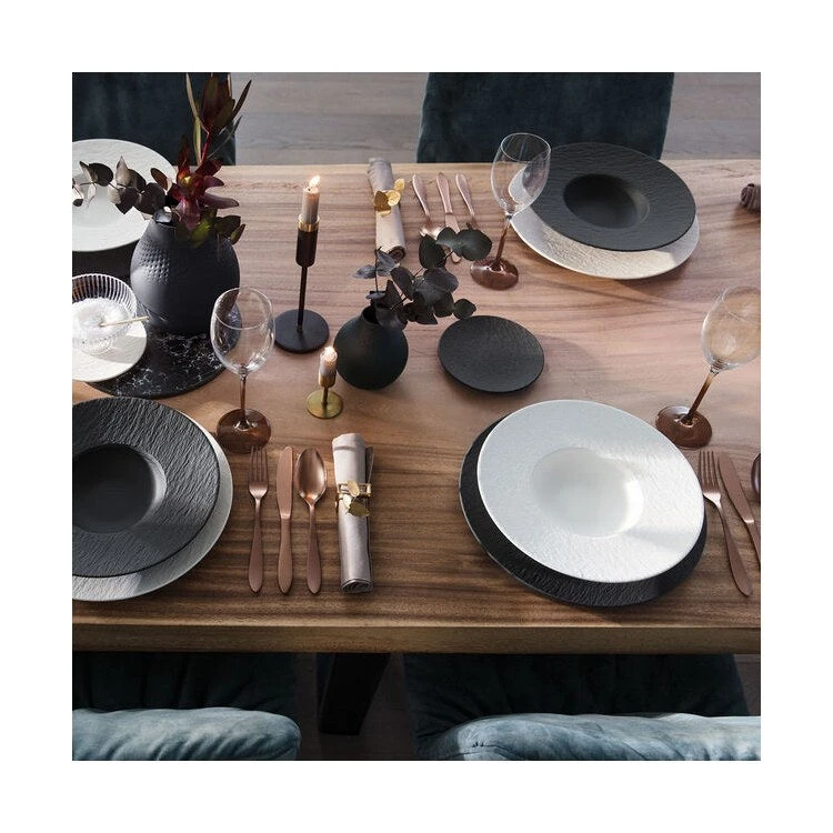The Manufacture collection from Villeroy & Boch combines premium porcelain with high-quality craftsmanship inspired by natural materials with strong color accents. Manufacture Rock and Rock Blanc offer a look that resembles natural slate, thanks to the light glaze that’s added over the porcelain to give the pieces that rustic, from-nature look. The color of Manufacture Rock resembles natural slate, while Rock Blanc offers pieces in a crisp white. Dishwasher and Microwave safe
