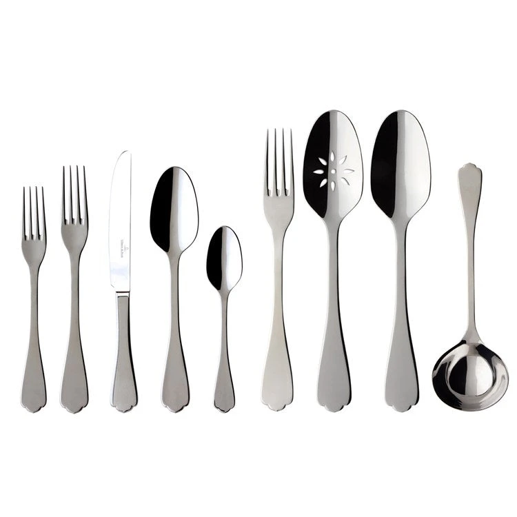 Medina flatware is designed with wonderful scalloped details and crafted from durable 18/10 stainless steel. Make every day stylish with this designer flatware. The 64-piece flatware set consists of twelve dinner spoons, twelve dinner forks, twelve dinner knives, twelve dessert forks, twelve teaspoons, and a four-piece serving utensil set that includes a meat fork, a pierced serving spoon, a vegetable spoon, and a gravy ladle.