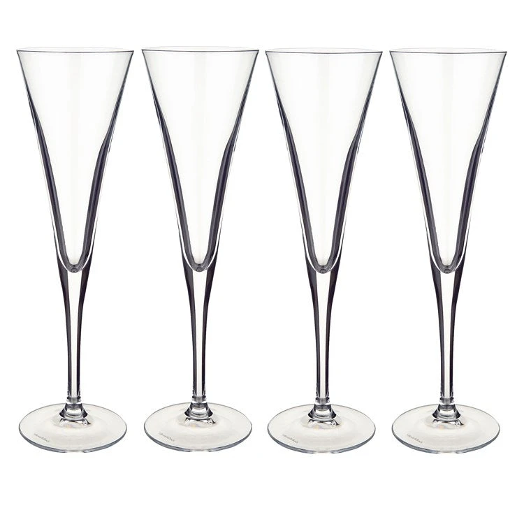 These stunning crystal glass champagne flutes feature graceful curves, long elegant stems and an everlasting crystal brilliance. Sold in a boxed set of four, this is the perfect gift for a loved or for yourself. Scratch and cloud resistant.